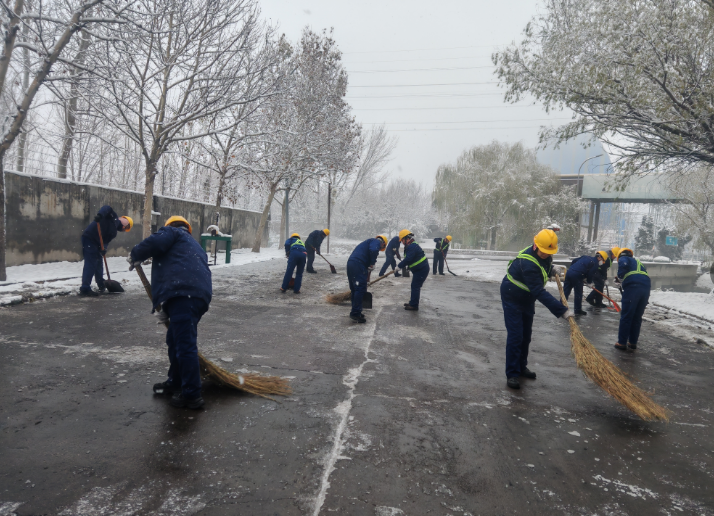 员工手持除雪锹,不惧严寒清理着积雪,在主干道上来回穿梭,在金能清出一条平安路。雪落无声,金能人始终以自强不息的韧劲穿越风雪 ,正如“从人类精神中爆发出来的创造力是永无止境”的企业信条,寒冬里的每一份坚守,都是向“基业长青”愿景的有力奔赴 。